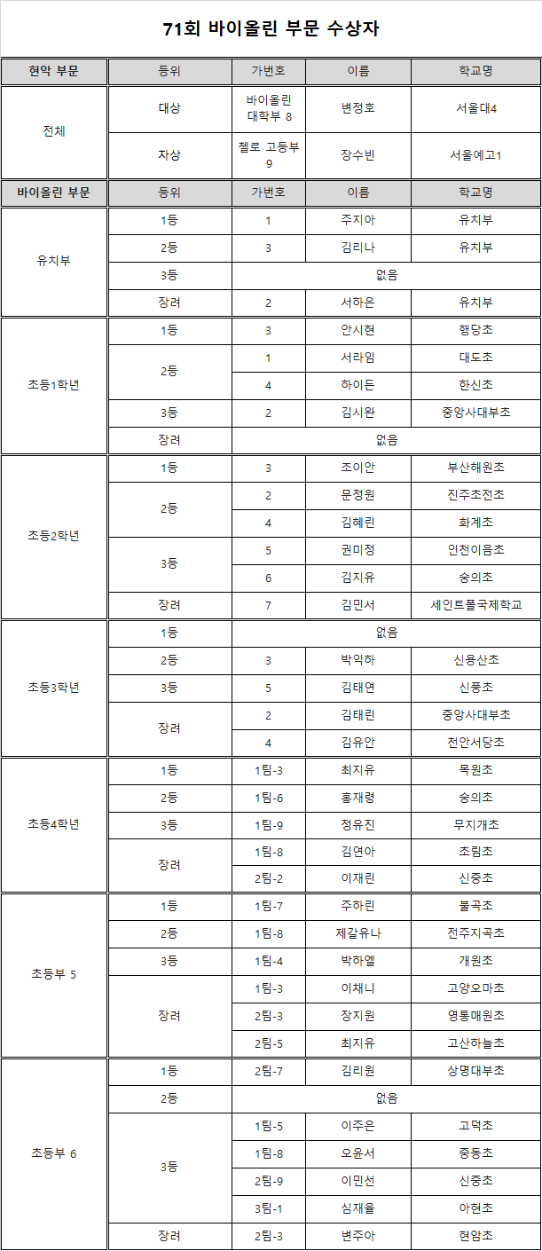 ※ 수상자 발표| 71회 콩쿠르 [ 현악 부문 전체 대상, 차상 / 바이올린(유, 초등부) ]