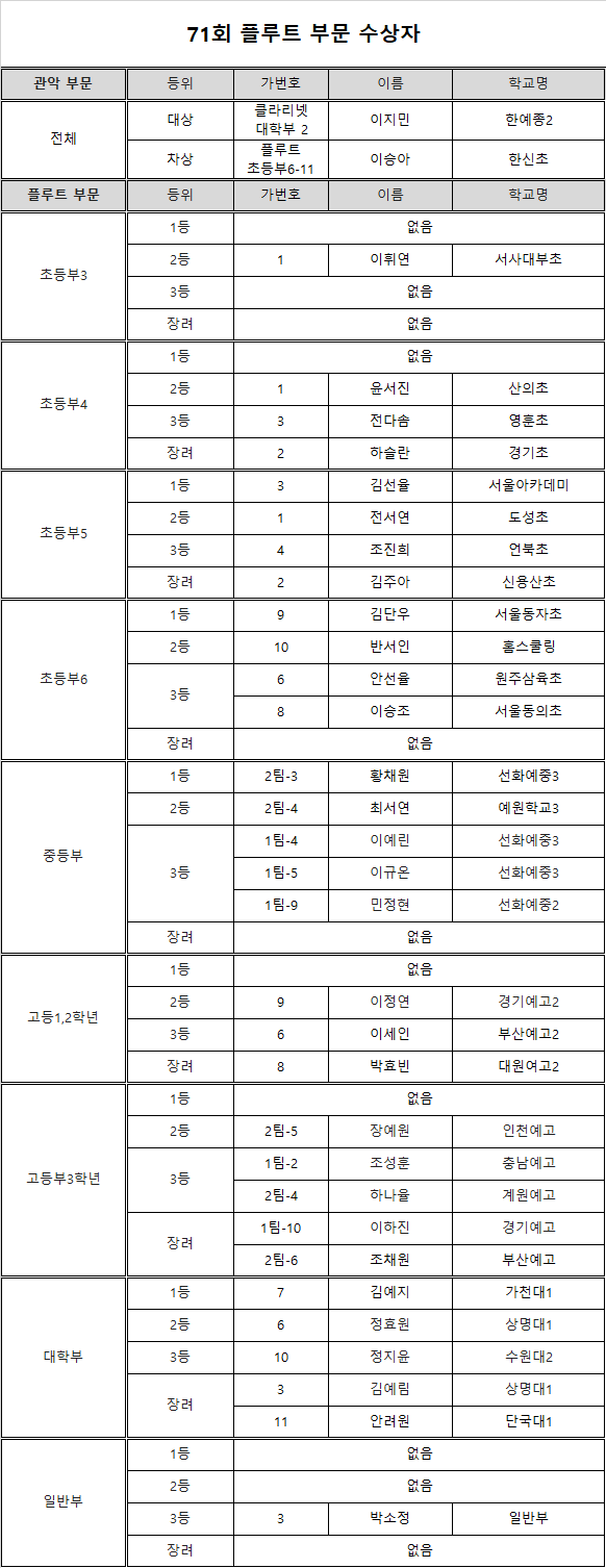 ※ 수상자 발표| 71회 콩쿠르 [ 관악 부문 전체 대상, 차상 / 플루트 ]