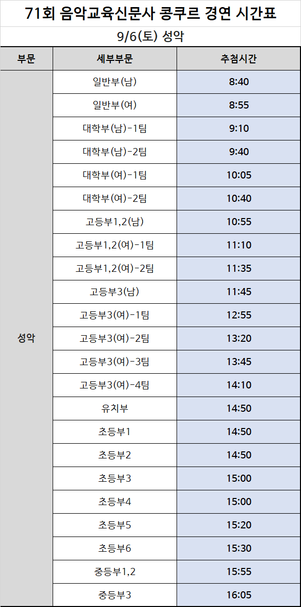 ▶71회 음악교육신문사 콩쿠르 추첨 시간표◀