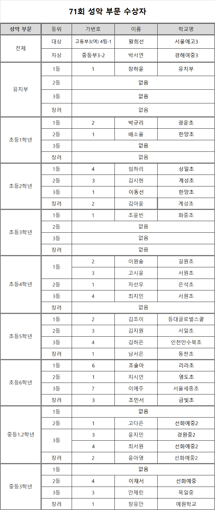 ※ 수상자 발표| 71회 콩쿠르 [ 성악 부문 전체 대상, 차상 / 유, 초등부 ]